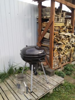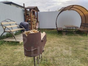 Во дворе оборудованная мангальная зона (мангал, казан, угольный гриль, шампура, решетка), дрова, футбольные ворота.