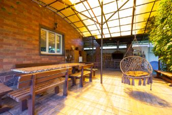 -мангальная зона с большим столом, холодильником, музыкальным центром и качелями под навесом