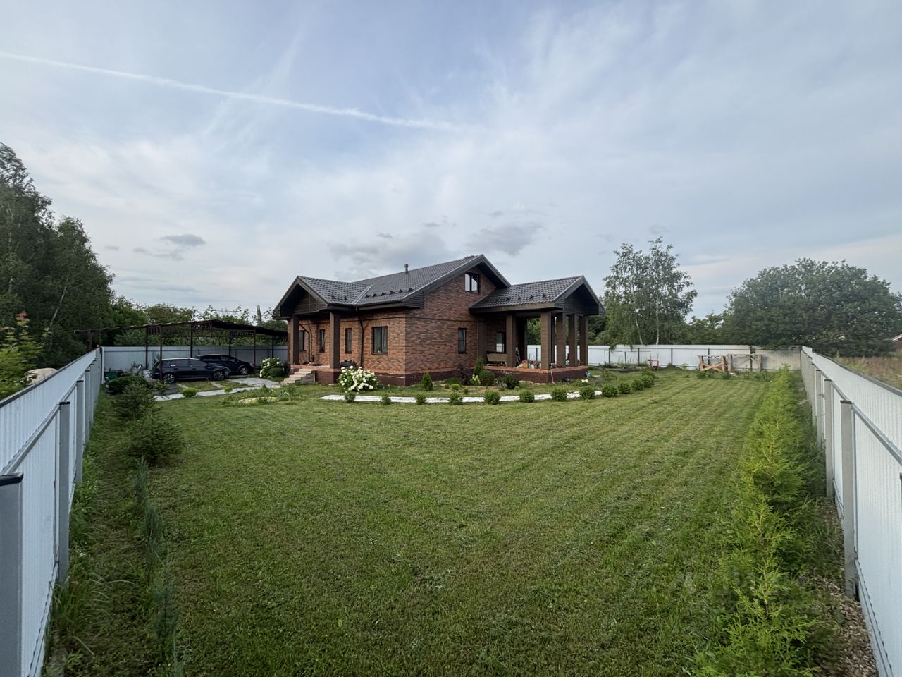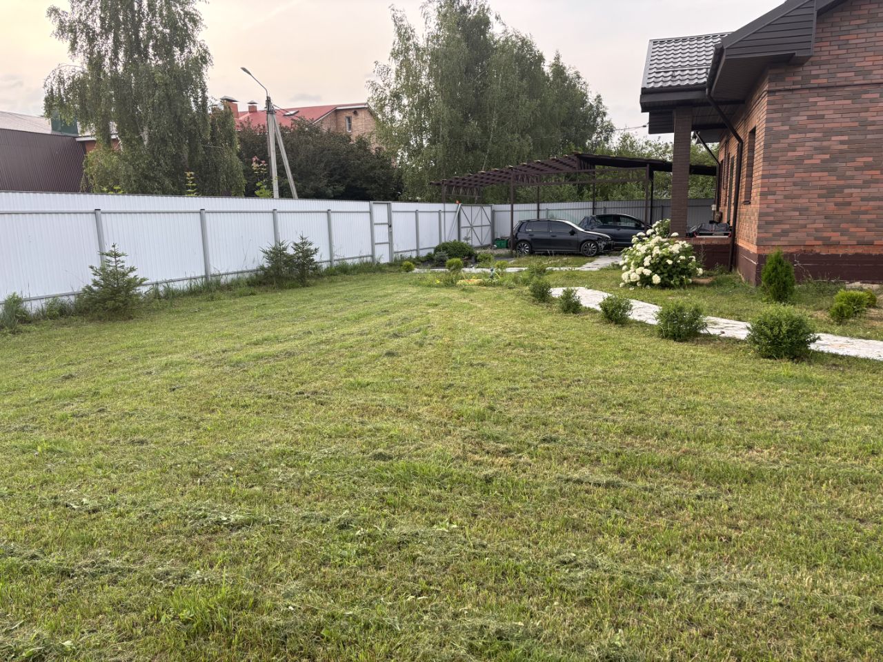 10 соток с ухоженным газоном, туями, бирючиной,декоративными елями и плодовыми деревьями.